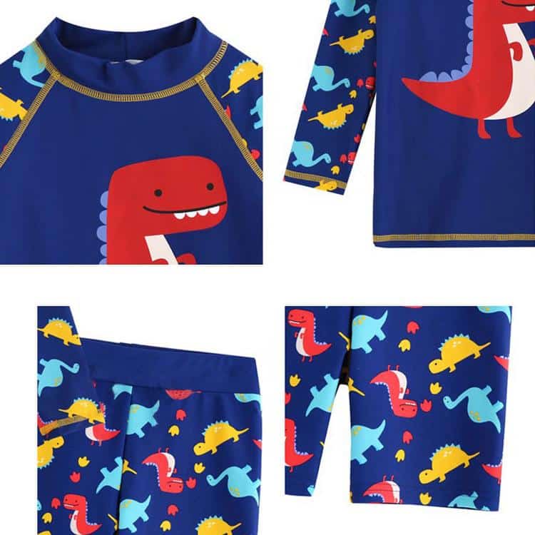 Questo splendido costume da bagno per bambini di colore blu scuro presenta una stampa di dinosauri che farà sicuramente la gioia del suo piccolo. I pantaloncini e la maglietta abbinati completano perfettamente il look. Realizzato in tessuti morbidi e traspiranti, questo costume da bagno è comodo e sicuro per il suo bambino.