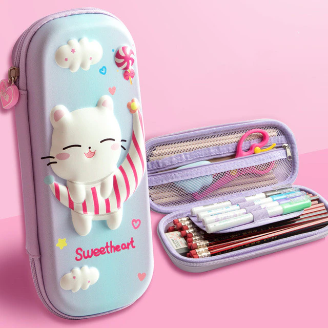 Ecco una bellissima custodia rigida per i suoi bambini. Si apre al centro con una cerniera. All\’interno, ci sono scomparti per penne e pennarelli. Il motivo del gatto sul coperchio è in rilievo e l\’astuccio è resistente agli schizzi.