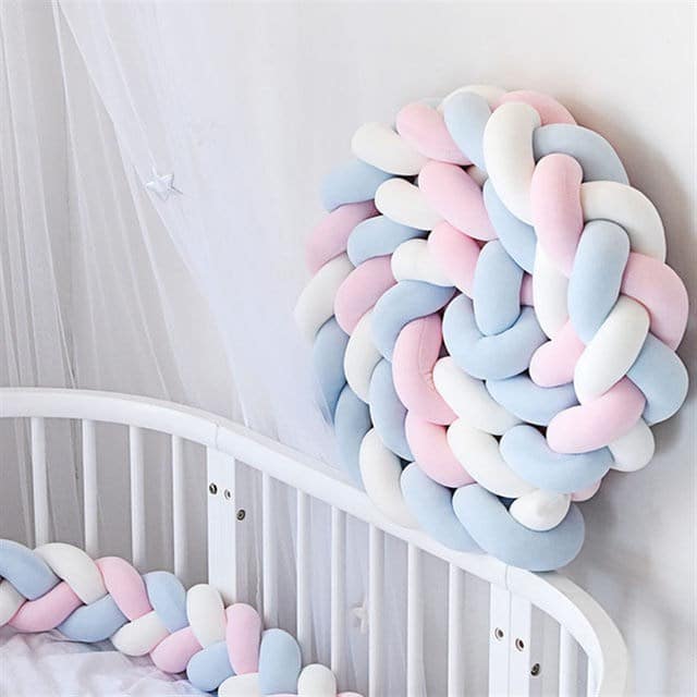 Paracolpi blu rosa bianco intrecciato. Il paracolpi perfetto per neonati e bambini! È realizzato in tessuto di cotone al 100%, che lo rende morbido al tatto e confortevole per il suo bambino. Il paracolpi è facile da indossare e da togliere, quindi può usarlo tutte le volte che vuole. È anche lavabile in lavatrice, in modo da poterlo mantenere pulito e fresco.